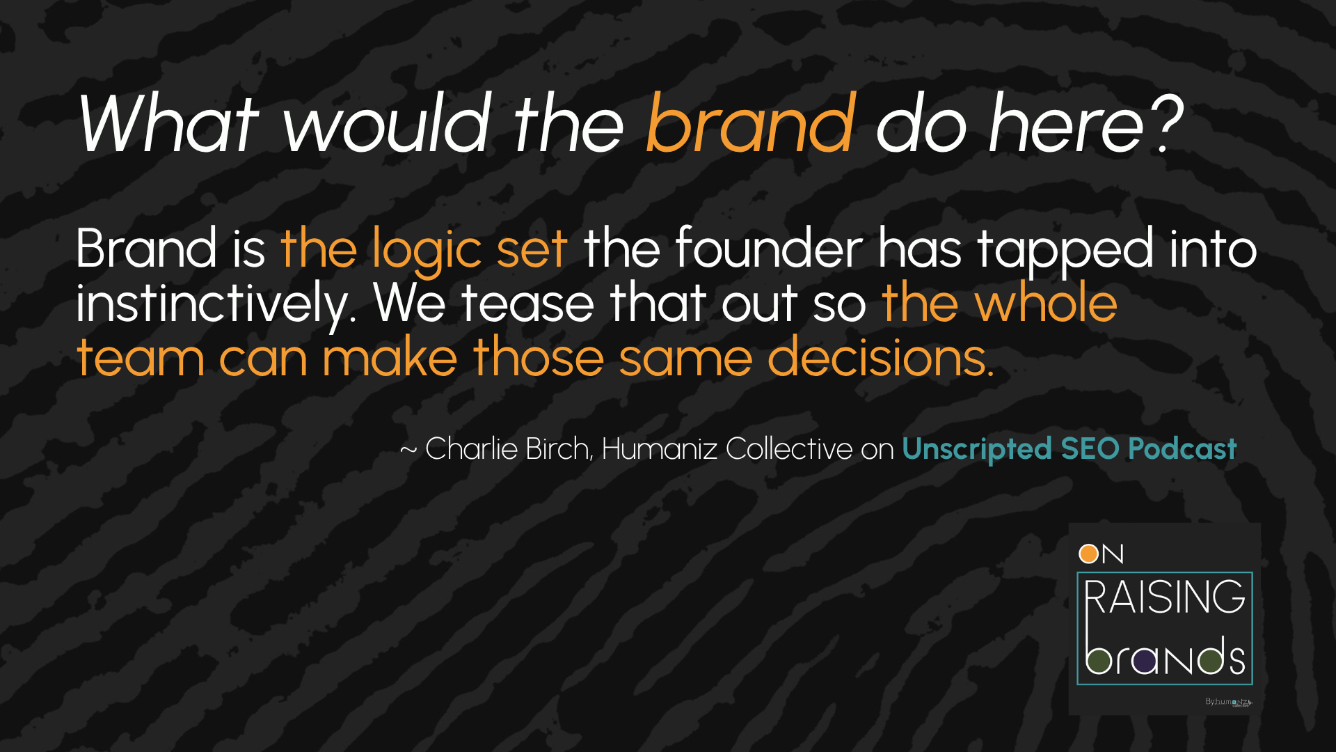 We look at: How do I tease the founder identity apart from the brand identity so it can be articulated, codified, and transferred to the whole team? Not just the marketing team — the sales team, the SEO team, the finance team, operations. Everyone gets that same lens of glasses, so they can ask: